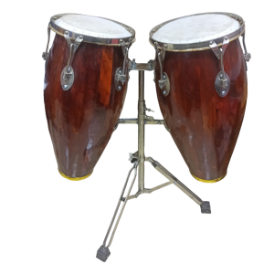Handcrafted in Kenya from durable Cyprus wood and fitted with natural goat hide drumheads, this pair of conga drums delivers warm, resonant tones with authentic character. Mounted on an adjustable metallic stand with rubber protectors, they combine traditional craftsmanship with modern stability.